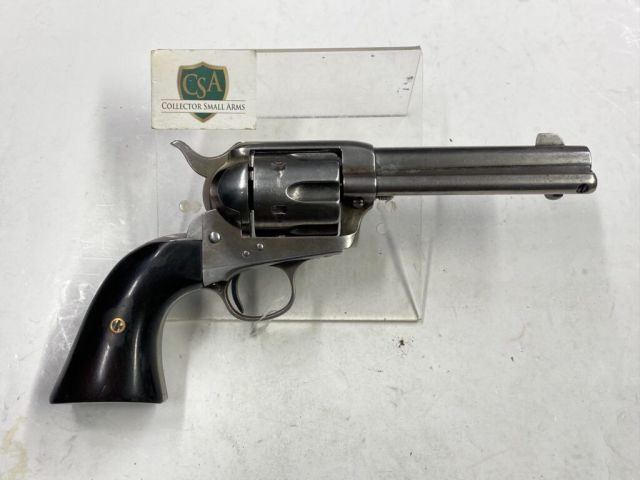 Anno 1902, Single Action Army di prima generazione originale, finitura “al grigio” mai ricondizionata, monomatricola, marchi ben evidenti, canna 4-3/4″ con scritta correttamente su due righe “COLT’S PT F.A MFG. Co. – HARTFORD. CT. U.S.A.” e sul lato l’indicazione del calibro “38 W.C.F.“, sul fusto i brevetti “PAT. SEPT.19.1871 – JULY.2.72. JAN. 19.75” e il logo del cavallino rampante nel cerchio. Guancette in legno di ebano, probabile sostituzione d’epoca. Una 1873 originale in buone condizioni considerai i 120 anni!