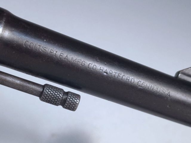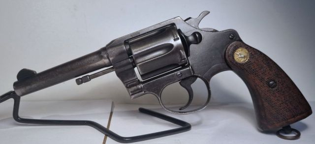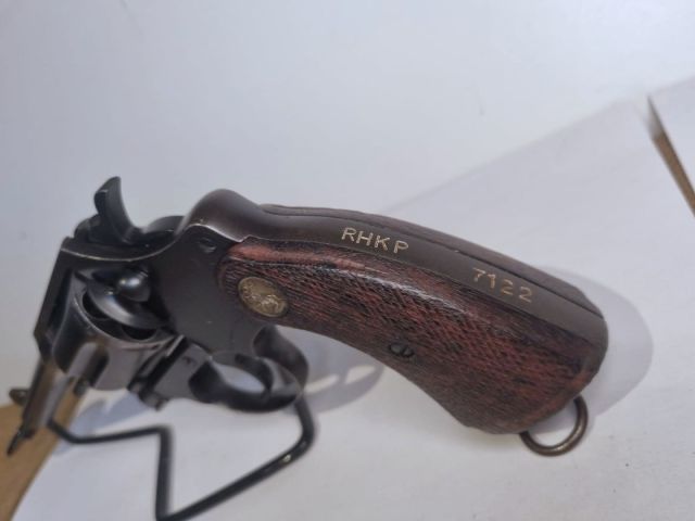 REVOLVER CAL. 38SW, 1958, 6 RD, CANNA 4 INCHES INTERNAMENTE OTTIMA, MECCANICA E TIMING PERFETTI CON TAMBURO SENZA GIOCHI, MARCATA RHKP ( ROYAL HONG KONG POLICE) E NUMERO DI REPARTO. BUONE CONDIZIONI GENERALI CON PROBABILE RIBRUNITURA EPOCA DATA LA TENUITA' DEI CARATTERI DELLE SCRITTE. GUANCETTE LEGNO ZIGRINATO CON MEDAGLIONE COLT E ANELLO PORTACORREGGIOLO.