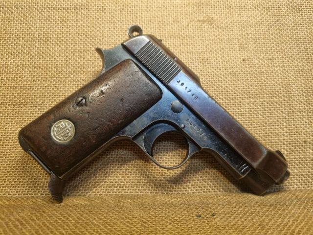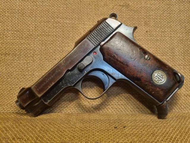 PISTOLA CAL. 7,65 BR, 1931, SECONDA COMMESSA DELLA REGIA MARINA, ANCORA SENZA PUNZONI SUL FUSTO - LE COMMERCIALI AVEVANO DA SUBITO IL MARCHIO DI GARDONE VT- MA SOLO CON LO STEMMA RM CON ANCORA SULLE GUANCETTE. COMPLETAMENTE MONOMATRICOLA CON CANNA OTTIMA, CONSERVA QUASI IL 90% DELLA SUA BRUNITURA ORIGINALE. E' FORSE UNA DELLE PRIME CON LE GUANCETTE ALTE A COPRIRE LA LEVA SGANCIO CANE. LA MATRICOLAZIONE PARTE DA 400001 CON CIRCA 7500/8000 PRODOTTE, DELLE QUALI CIRCA LA META' CONSEGNATE ALLA REGIA MARINA.