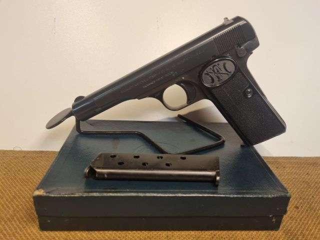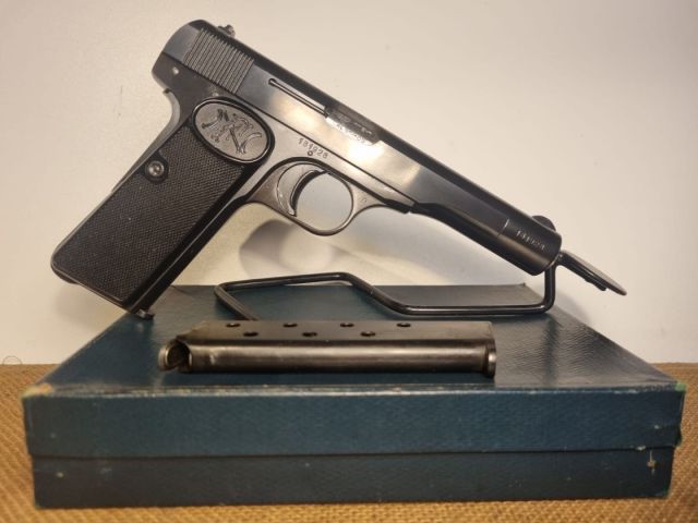 ULTERIORI INFORMAZIONI: PISTOLA CAL.9 CORTO, POSTBELLICA, COMMERCIALE, 9RD, TUTTA ACCIAIO, BRUNITA, SICIRA MANUALE E ALL'IMPUGNATURA, MONOMATRICOLA, CANNA PERFETTA, NUOVA INUSATA NELLA SUA SCATOLA EPOCA CON CARICATORE SCORTA.