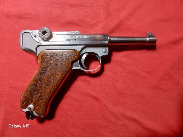 Luger croce nello scudo inox 9x21, di produzione americana commissionata dall'esercito Svizzero in pochi esemplari, pari al nuovo, sparati 190 colpi di prova, corredata di fodero, 2 caricatori, 3 set di guancette di cui uno originale