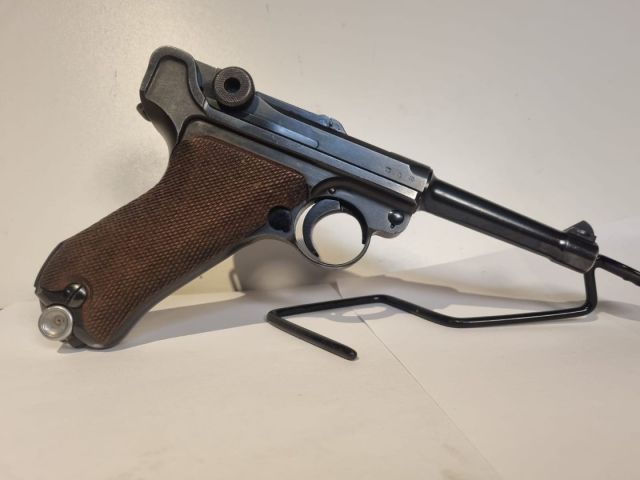 ULTERIORI INFORMAZIONI: PISTOLA SPORTIVA CAL. 9X19 MARCATA S/42 DEL 1937, MONOMATRICOLA ANCHE GUANCETTE E CARICATORE, CANNA OTTIMA CON RIGATURA BEN PROFILATA ANCHE SE NON A SPECCHIO, CONSERVA OLTRE IL 95% DELLA SUA BRUNITURA ORIGINALE.