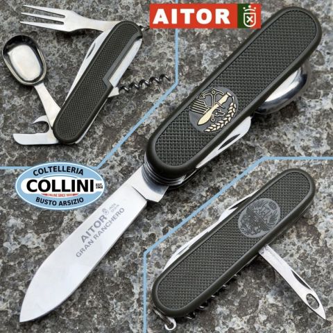 L'AITOR Pocket Knife 284.172 Gran Ranchero è un coltello multiuso vintage, rinomato per la sua qualità e versatilità. Prodotto in Spagna tra gli anni 80 e 90, questo coltello è ideale per campeggio, escursionismo e altre attività outdoor grazie ai suoi numerosi utensili integrati. Caratteristiche Principali Modello: 284.172 Gran Ranchero Produttore: AITOR Origine: Spagna Materiale delle Lame: Acciaio inossidabile di alta qualità Impugnatura: Materiale sintetico resistente con finitura antiscivolo Lunghezza totale: Circa 20 cm (aperto) Lunghezza chiusa: Circa 11 cm Peso: Leggero e facile da trasportare Utensili Multiuso Lama principale: Per tagliare e sbucciare Cavatappi: Per aprire bottiglie di vino Apriscatole: Per aprire lattine Apribottiglie: Per aprire bottiglie con tappo a corona Cucchiaio: Utile per pasti all'aperto Forchetta: Per completare il set di posate da campeggio Funzionalità Design compatto: Facile da trasportare, si adatta comodamente in tasca o nello zaino Sistema di c