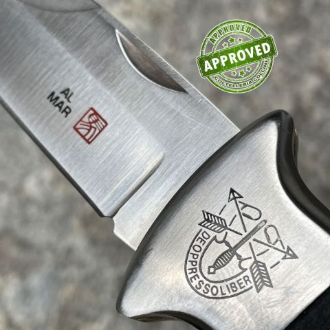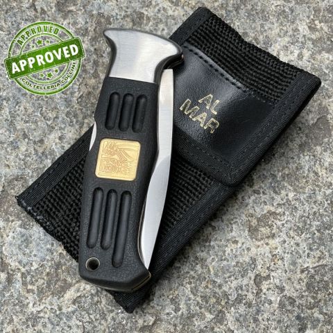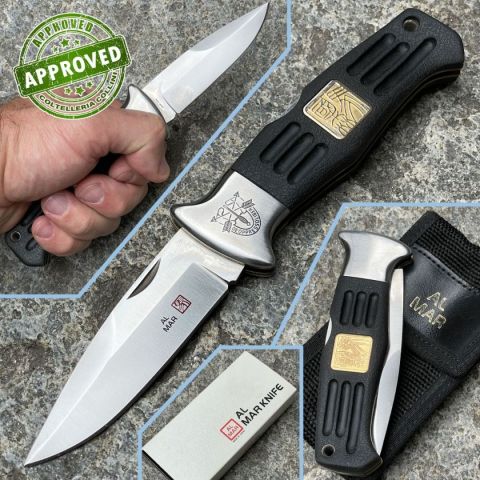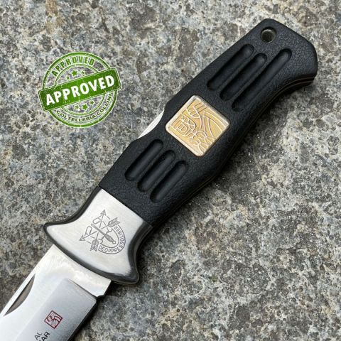 COLTELLO RITIRATO DA COLLEZIONE PRIVATA* Tipologia: Precedentemente Acquistato* Condizioni: Ottime condizioni, vicino al nuovo* Reperibile in commercio Fuori produzione* Affilatura: Di fabbrica* Segni su lama: No* Segni su impugnatura: leggero scolorimento degli inserti in ottone dovuti dal tempo* Scatola: Presente - Originale* Fodero: Presente - Originale* Manuali, Certificati e Garanzie: -* Controllato e Certificato dal nostro laboratorio interno Destinazione d'uso: Collezione / Tattico Tipo di produzione: IndustriaePaese di produzione: Seki - GiapponeLama: in acciaio inox AM-6Trattamento lama: satinaturaManicatura: in gomma, con cartelle interne in ottone e testine in acciaio inoxLunghezza lama: 89mm.Spessore lama: 3mm.Lunghezza chiuso: 117mmLunghezza totale: 202mm.Peso: 175g.Chiusura: Back LockFodero: In nylon, con passante da cintura e chiusura in velcroConfezione: scatola di cartone con loghi Al MarNote: precedentemente acquistato, in condizioni vicine al nuovo, full set,