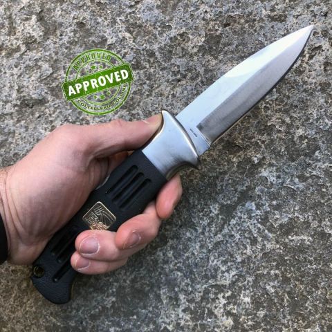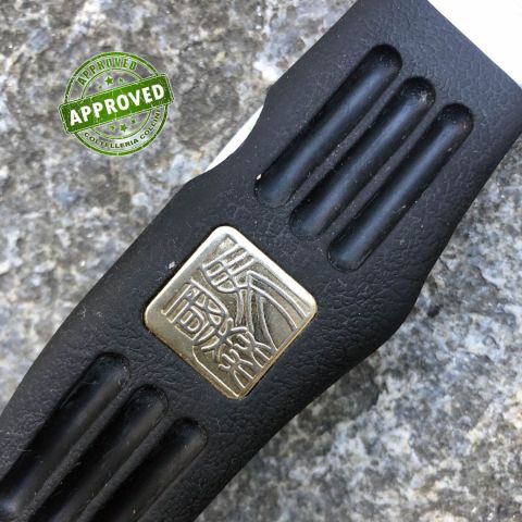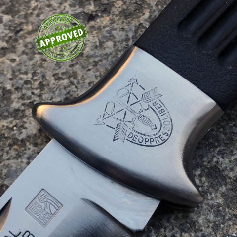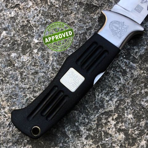 Raro coltello prodotto dalla giapponese Al-Mar tra la fine degli anni '80 e gli inizi degli anni '90 ormai fuori produzione e non più reperibile. Coltello ritirato da collezione privata e fuori produzione - Coltello leggermente usato, con piccoli segni poco profondi sul lato sinistro della lama, fodero originale in cuoio mai utilizzato e mai indossato, comprensivo di scatola (non originale). L'impugnatura in gomma presenta una lieve rottura, con piccola parte mancante, nella parte posteriore alta destra, vicino al correggiolo. - Controllato, riaffilato e certificato dal nostro laboratorio interno Coltelleria Collini. Destinazione d'uso: Collezione / TatticoTipo di produzione: IndustriaePaese di produzione: Giappone, SekiLama: in acciaio inox AM-6Trattamento lama: satinaturaManicatura: in gomma, con spaziatori in ottoneLunghezza lama: 110mm.Spessore lama: 4mm.Lunghezza chiuso: 150mmLunghezza totale: 255mm.Peso: 320g.Chiusura: Back LockFodero: in cuoio, nuovoConfezione: scato