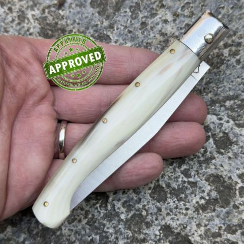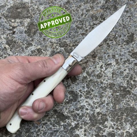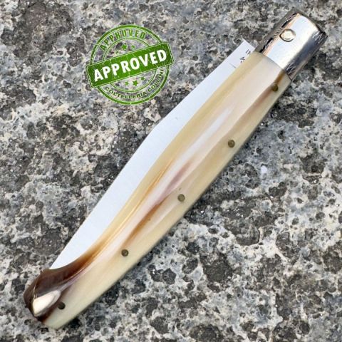 COLTELLO RITIRATO DA COLLEZIONE PRIVATAProvenienza: Ritirato da un privato, precedentemente acquistatoCondizioni: Pari al nuovoReperibile in commercio: Reperibile in commercioAffilatura: Di fabbricaSegni su lama: NessunoSegni su impugnatura: NessunoScatola: -Fodero: -Manuali, Certificati e Garanzie: -Controllato e Certificato dal nostro laboratorio interno Coltello pattada, realizzato interamente ed artigianalmente in Sardegna, con materiali accuratamente selezionati da Roberto Monni, maestro nell'antica tradizione della coltelleria sarda. Paese di produzione: ItaliaLama: Acciaio inox X50CrMoV15Finitura lama: satinaturaManicatura: corno di bueLunghezza lama: 95mm.Spessore della lama: 2mm.Lunghezza chiuso: 127mm.Lunghezza totale: 235mm.Peso: 35g.Chiusura: privo di bloccoFodero: astuccio in pelle scamosciata L’artigianato è bello perché è vario I colori dei materiali con cui sono realizzati i prodotti artigianali possono variare rispetto