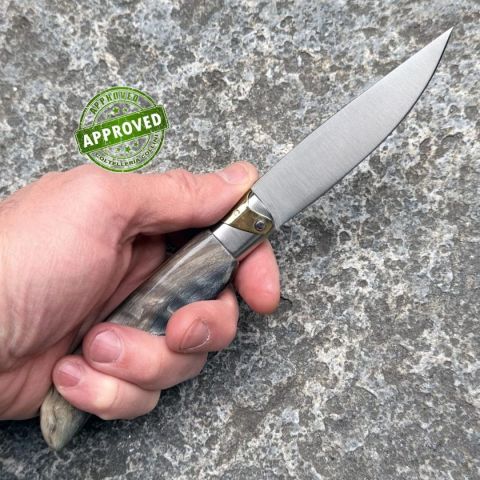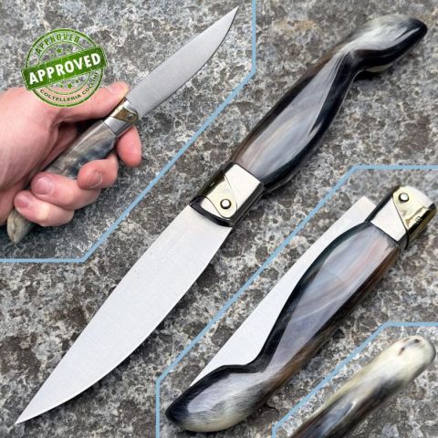 COLTELLO RITIRATO DA COLLEZIONE PRIVATA* Provenienza: Ritirato da un privato, precedentemente acquistato* Condizioni: Pari al nuovo, mai utilizzato* Affilatura: Di fabbrica* Segni su lama: Nessuno* Segni su impugnatura: Nessuno* Scatola: -* Manuali, Certificati e Garanzie: Presenti* Controllato e Certificato dal nostro laboratorio interno Descrizione introduttiva: Il S’Asseminesa è un coltello tradizionale sardo reinterpretato dall’artigiano Efisio Casula di Assemini (Sardegna), dove la maestria manuale si fonde con la cultura locale delle rezze‑tipo sarde; progettato per uso quotidiano e collezionistico, esprime la combinazione di tradizione e sapienza tecnica nella selezione dei materiali e nelle finiture artigianali, offrendo un equilibrio fra precisione di taglio e ergonomia del manico.Destinazione d’uso: coltello artigianale multiuso – cucina, lavoro leggero, oggetto da collezioneTipo di produzione: artigianale, realizzato a mano nel laboratorio di Co