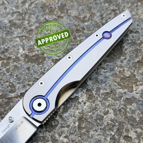 COLTELLO RITIRATO DA COLLEZIONE PRIVATA* Provenienza: Ritirato da un privato, precedentemente acquistato* Condizioni: Globalmente in eccellenti condizioni, mostra qualche piccolo segno dato dal tempo e qualche piccola abrasione sull'impugnatura in titanio, meccanicamente impeccabile* Reperibile in commercio: Fuori produzione* Affilatura: Di fabbrica* Segni su lama: Nessuno* Segni su impugnatura: piccole abrasioni sul titanio date dal tempo * Scatola: Presente e completa* Fodero: Presente, con segni dati dal tempo, ma che non ne compromettono l'utilizzo* Manuali, Certificati e Garanzie: Presenti* Controllato e Certificato dal nostro laboratorio interno Questo coltello con blocco liner lock di Klotzli Knives of Switzerland è un raffinato modello dei primi anni 2000 di Wimpff Design, realizzato con telaio in titanio fresato ed anodizzato bicolore, impreziosito da una vera pietra di opale incastonata. La lama in stile Wharncliffe, con finitura satinata, si distingue per precisione ed