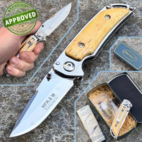 COLTELLO RITIRATO DA COLLEZIONE PRIVATA* Provenienza: Ritirato da un privato, precedentemente acquistato* Condizioni: in ottime condizioni, pari al nuovo* Reperibile in commercio: ancora in commercio* Affilatura: originale* Segni su lama: Nessuno* Segni su impugnatura: qualche piccola abrasione data dallo scorrere del tempo* Confezione: astuccio in cuoio con laccio realizzato argianalmente* Fodero: -* Manuali, Certificati e Garanzie: certificati MARTTIINI* Controllato e Certificato dal nostro laboratorio interno Il Marttiini Folding Knife MFK-2 W è un coltello pieghevole di taglia media progettato per un utilizzo quotidiano affidabile e per attività outdoor leggere, in piena coerenza con la tradizione funzionale del marchio finlandese. Il progetto privilegia robustezza strutturale, semplicità costruttiva e materiali naturali, offrendo una lama in acciaio inossidabile facile da mantenere e un’impugnatura ergonomica pensata per un