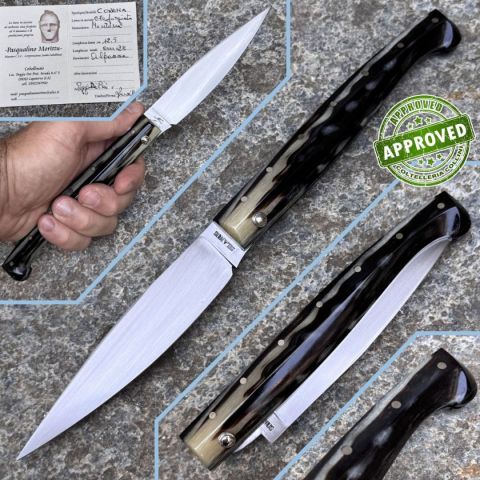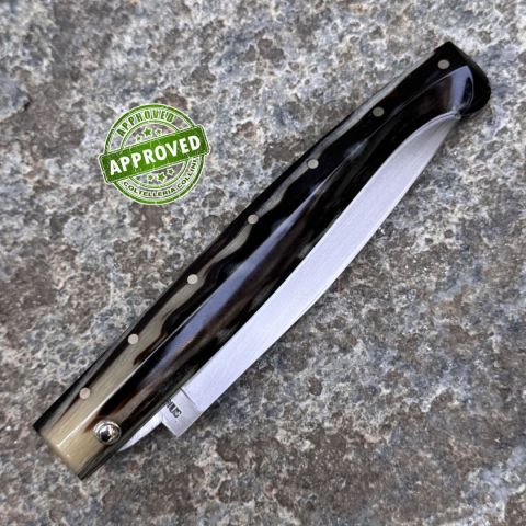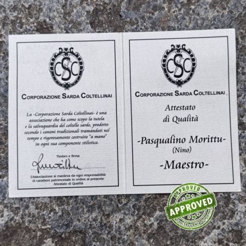 COLTELLO RITIRATO DA COLLEZIONE PRIVATA* Provenienza: Ritirato da un privato, precedentemente acquistato* Condizioni: in condizioni pari al nuovo* Reperibile in commercio: pezzo unico artigianale* Affilatura: originale* Segni su lama: Nessuno* Segni su impugnatura: Nessuno* Scatola: /* Fodero: -* Manuali, Certificati e Garanzie: SI* Controllato e Certificato dal nostro laboratorio interno Destinazione d'uso: RegionaleTipo di produzione: ArtigianaleProduzione Lama: ItaliaLama: In acciaio inox C70Trattamento Lama: -Manicatura: corno montoneLunghezza lama: 125mm.Spessore lama: 3mm.Lunghezza chiuso: 155mm.Lunghezza totale: 280mm.Spessore da chiuso: 19mmBilanciatura: -Peso: 105g.Chiusura: privo di blocco lamaClip: -Fodero: -Confezione: confezione rigida con certificato produzione artigianale firmata da MorittuNote: - Nino Morittu - Coltellaio di Silanus, Provincia di Nuoro Nino Morittu realizza coltelli unici, pezzi di rara bellezza artigianale progettati, dise