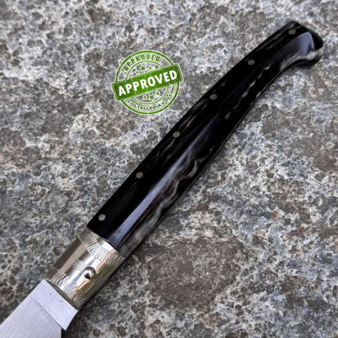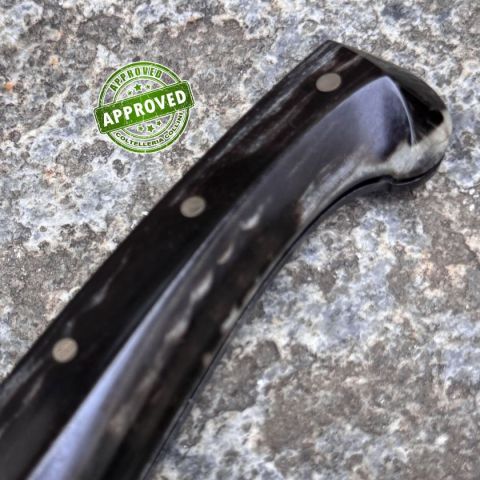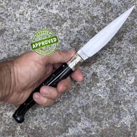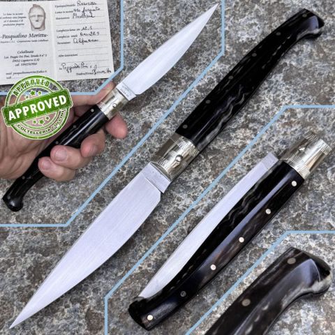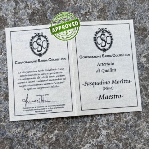 COLTELLO RITIRATO DA COLLEZIONE PRIVATA* Provenienza: Ritirato da un privato, precedentemente acquistato* Condizioni: in condizioni pari al nuovo* Reperibile in commercio: pezzo unico artigianale* Affilatura: originale* Segni su lama: Nessuno* Segni su impugnatura: Nessuno* Scatola: /* Fodero: -* Manuali, Certificati e Garanzie: SI* Controllato e Certificato dal nostro laboratorio interno Destinazione d'uso: RegionaleTipo di produzione: ArtigianaleProduzione Lama: ItaliaLama: In acciaio inox C70Trattamento Lama: -Manicatura: corno montoneLunghezza lama: 120mm.Spessore lama: 3mm.Lunghezza chiuso: 155mm.Lunghezza totale: 280mm.Spessore da chiuso: 19mmBilanciatura: -Peso: 114g.Chiusura: privo di blocco lamaClip: -Fodero: -Confezione: confezione rigida con certificato produzione artigianale firmata da MorittuNote: - Nino Morittu - Coltellaio di Silanus, Provincia di Nuoro Nino Morittu realizza coltelli unici, pezzi di rara bellezza artigianale progettati, dise
