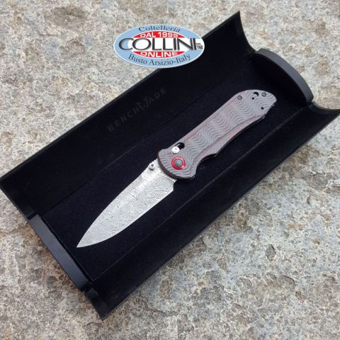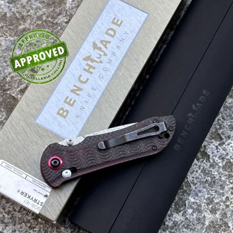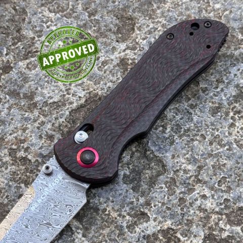 COLTELLO PRECEDENTEMENTE ACQUISTATO, RITIRATO DA COLLEZIONE PRIVATA* Tipologia: coltello precedentemente acquistato, proveniente da una collezione privata* Condizioni: pari al nuovo, mai utilizzato* Reperibile in commercio: Fuori produzione* Affilatura: Di fabbrica* Segni su lama: Nessuno* Segni su impugnatura: Nessuno* Scatola: Presente* Fodero: -* Manuali, Certificati e Garanzie: Presenti* Controllato e Certificato dal nostro laboratorio interno Destinazione d'uso: Collezione/TatticoTipo di produzione: Semi-IndustrialePaese di produzione: USALama: in damasco inox Damasteel con disegno Odin HeimManicatura: in fibra di carbonio rossa e nera con spaziatori in alluminio anodizzato rossoLunghezza lama: 90mm.Spessore lama: 3.15mm.Lunghezza chiuso: 119mm.Lunghezza totale: 210mm.Peso: 135g.Chiusura: Axis LockClip: Amovibile e reversibile, in acciaio inoxFodero: Sacchetto in tessuto nero con loghi Benchmade doratiConfezione: Scatol