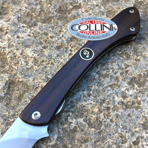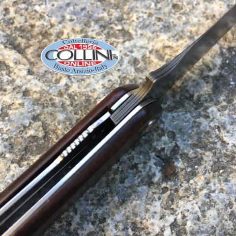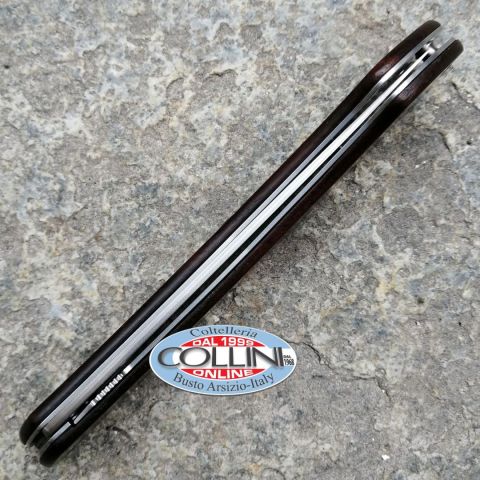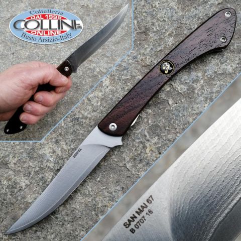Gli artigiani di Berkel hanno realizzato una serie esclusiva di coltelli serramanico. La ricerca degli acciai per la lama e di materiali pregiati per il manico, fanno di questi coltelli dei veri oggetti da collezione. Questi pezzi unici sono numerati uno ad uno dai maestri del taglio di Berkel. - Materiale lama: Acciaio San Mai 67 Damasco + VG10 (60/61 HRC)- Lunghezza lama: Lama lunga 11 cm- Lunghezza totale: 25.5 cm- Peso: 78 gr- Affilatura: Liscia- Impugnatura: guancette in legno Palissandro. Decorata con logo nero lucido.- Note: privo di scatola, con astuccio in vinile Già nel 1100 gli esperti fabbri giapponesi univano infatti diversi materiali tra di loro per conferire alle spade Katana doti di taglio, resistenza e flessibilità prima di allora sconosciute. Ispirandosi a questa tradizione, Berkel ha realizzato una serie di coltelli in acciaio Giapponese SanMai. La lama si compone di uno strato centrale in acciaio VG-10 estremamente duro, che la mantiene aff