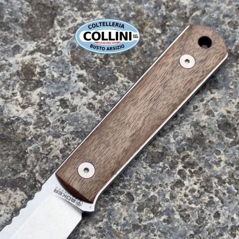 Böker BFF Packlite è un coltello fisso ultraleggero progettato dal rinomato knifemaker Lucas Burnley. Caratterizzato da un design minimalista e funzionale, questo modello fa parte della serie Barlow BFF, ampliata con una versione skeletonized per massimizzare la leggerezza senza compromettere la robustezza. La lama in acciaio CPM-MagnaCut con finitura stonewashed assicura eccezionale resistenza all'usura, durezza 61-62 HRC e una straordinaria capacità di taglio. Il manico è dotato di guancette rimovibili in Legno di Noce che garantisce un’ottima presa e un'estetica naturale. Le fresature sulla struttura scheletrata riducono ulteriormente il peso e conferiscono un look aggressivo e moderno. Perfetto come coltello EDC, Light Utility o da Backup, il Böker BFF Packlite è versatile e pronto per qualsiasi sfida. Viene fornito con un robusto fodero in Kydex e una catena a sfere per il porto come neck knife. Prodotto artigianalmente in Solingen, Germania, è la scelta ideale per chi cerca un co