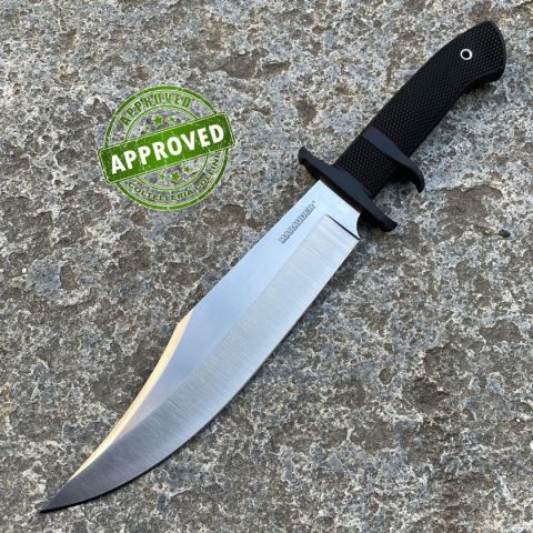 COLTELLO RITIRATO DA COLLEZIONE PRIVATA* Provenienza: Ritirato da un privato, precedentemente acquistato, PRIVO DI SCATOLA* Condizioni: condizioni generali molto buone, mai usato* Reperibile in commercio: attualmente in produzione solo con filo serrated* Affilatura: di fabbrica* Segni su lama: nessuno di particolare* Segni su impugnatura: assenti* Scatola: -* Fodero: in buone condizioni generali, un po' segnato sul lato destro (ved. foto)* Manuali, Certificati e Garanzie: -* Controllato e Certificato dal nostro laboratorio interno Il Cold Steel Marauder Bowie è un'ottima interpretazione di un bowie classico di grandi dimensioni, realizzato con materiali moderni e durevoli. Impiego: Sportivo Tipo di produzione: industrialePaese di Produzione: TaiwanLama: acciaio inox AUS-8AFinitura Lama: satinataManicatura: Kray-Ex kratonLunghezza lama: 228mm.Spessore lama: 4,7mm.Lunghezza totale: 359mm.Bilanciatura: sul ramo di guardiaPeso: 338g. (467g. fodero c