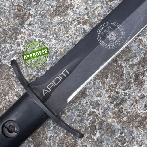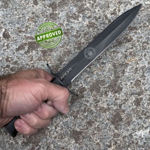 COLTELLO RITIRATO DA COLLEZIONE PRIVATA* Provenienza: Ritirato da un privato, precedentemente acquistato* Condizioni: Globalmente in buone condizioni* Reperibile in commercio: Ancora a catalogo* Affilatura: Di fabbrica* Segni su lama: Segni ed abrasioni* Segni su impugnatura: Piccoli segni di usura* Scatola: Presente, non completa (assenza di garanzie e sacchetti plastici)* Fodero: Presente, in buone condizioni* Manuali, Certificati e Garanzie: -* Controllato e Certificato dal nostro laboratorio interno La particolare situazione creatasi nei primi anni della guerra 1914/18, ormai impantanata in trincee e fortificazioni sempre più complesse e protette, favorì presso i vari reparti la costituzione di formazioni di uomini che, poco alla volta, si specializzarono nel colpo di mano. I nostri reparti d’assalto, gli Arditi, ebbero il loro pugnale. Era ricavato dagli spezzoni asportati dalle lunghe lame delle baionette Vetterli 1870, che nelle strette trincee, nei corridoi, tra i reticolati er