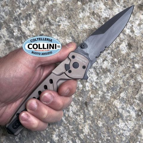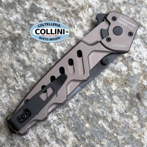 Il Caimano Nero è un coltello tattico che Extrema Ratio, fornitore ufficiale del Comsubin, ha sviluppato e consegnato al G.O.I. (Gruppo Operativo Incursori) della Marina Militare Italiana. Il suo nome rievoca ed omaggia gli eroici Caimani Neri del Piave, reparto di Arditi della Regia Marina ed altri componenti su base volontaria, che durante la Prima guerra mondiale attraversavano a nuoto il Piave per effettuare incursioni in territorio nemico. Lama Spear Point da 4mm. con arrotatura asimmetrica per aumentarne il coefficiente di penetrazione. La dentatura presente sulla lama permette di tagliare cavi e tessuti ad alta resistenza preservando l’affilatura. È un medium folder con struttura robusta. Le guancette in alluminio dallo spessore elevato, grazie alle numerose lavorazioni di asportazione rendono il coltello leggero e bilanciato. La parte terminale dell’impugnatura, che richiama la forma del gruppo Elica/Timone del siluro a lenta corsa (S.L.C.), serve a migliorare la presa per l’es