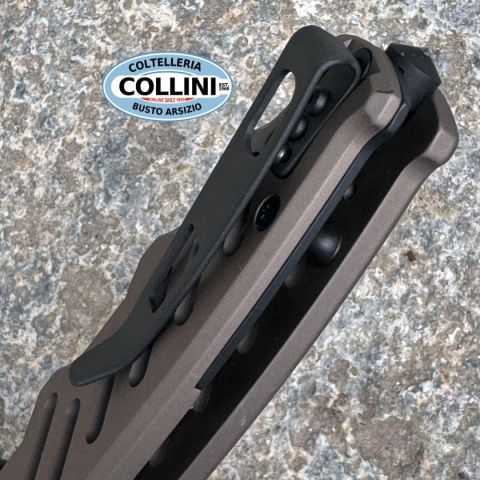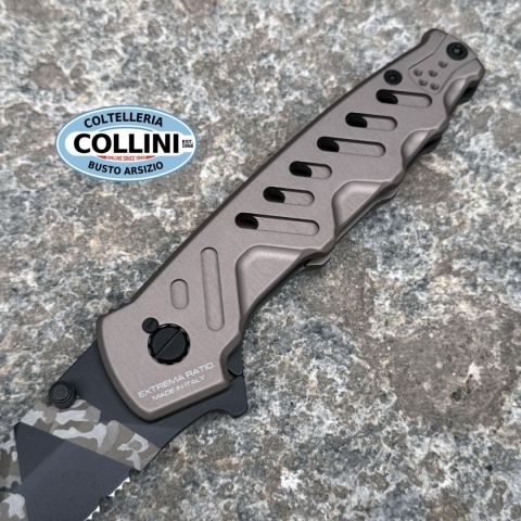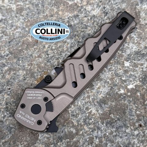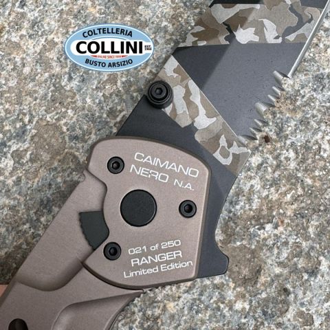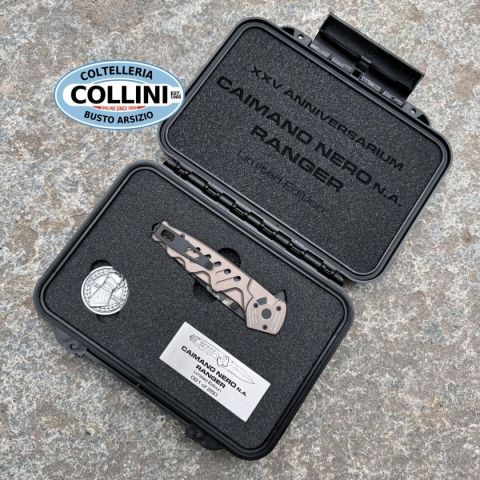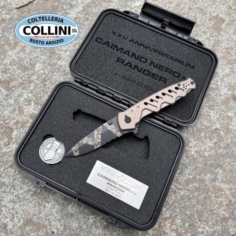 Extrema Ratio Caimano Nero N.A. Ranger XXV Anniversarium Limited Edition è una versione in serie limitata a soli 250 esemplari che conserva intatte tutte le caratteristiche del celebre modello Caimano Nero N.A., versione non automatica del coltello tattico che Extrema Ratio ha consegnato al G.O.I. (Gruppo Operativo Incursori) della Marina Militare Italiana.Caimano Nero N.A. Ranger XXV Anniversarium Limited Edition va ad aggiungersi ai modelli in serie limitata che Extrema Ratio ha creato in occasione della chiusura del venticinquesimo anno di attività.La lama con spessore di 4 mm ha una punta di forma spear-point con arrotatura asimmetrica, la dentatura permette di tagliare cavi e tessuti ad alta resistenza preservando l’affilatura. La finitura è caratterizzata dalla personalizzazione Geotech Camo, l’innovativo ed originale pattern mimetico Extrema Ratio, realizzato mediante incisione laser.Il manico è composto da 2 guancette in materiale alluminio anticorodal anodizzato nella nuovissi