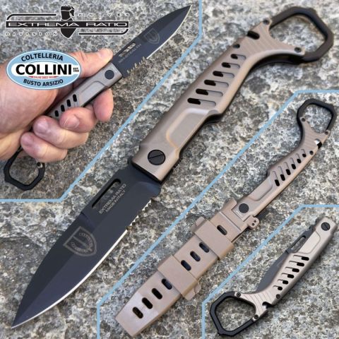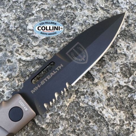 Il MH-STEALTH di Extrema Ratio è un coltello tattico pieghevole d’avanguardia, frutto della collaborazione con gli operatori del Kommando Spezialkräfte (KSK) e la Gemeinschaft Deutscher Kommandosoldaten.Nato da un disegno a mano libera, è stato trasformato in uno strumento compatto e funzionale, pensato per un impiego operativo reale.Il nome MH rende omaggio ai professionisti coinvolti nello sviluppo, mentre "Stealth" sottolinea la capacità di occultamento e l'estrema compattezza del coltello.Dotato di lama in acciaio Böhler N690 con finitura brunita MIL-C-13924 e incisione del logo KSK, presenta una seghettatura alla base per tagli rapidi su materiali resistenti.Il sistema di blocco è il collaudato liner lock.L'impugnatura in alluminio anticorodal anodizzato, colorazione Tactical Mud, integra un anello posteriore per una presa sicura, un frangivetro in metallo duro e un taglia cinture di sicurezza con lama tipo cutter.Il fodero rigido ASPIS consente il trasporto sicuro in posizione ap