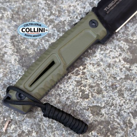 Potenza e Resistenza ai Massimi LivelliIl Tuscan S600 Black di Extrema Ratio è un coltello tattico di alta gamma, progettato per garantire prestazioni eccezionali in scenari operativi complessi. Realizzato con acciaio Böhler S600 temprato criogenicamente a 64 HRC, offre una durezza e una resistenza all’usura senza pari, assicurando un filo di taglio affilato più a lungo. La finitura EXP DARK protegge la lama dall’ossidazione, rendendola più durevole anche in condizioni ambientali estreme.La costruzione full tang alleggerita ottimizza il bilanciamento del coltello, spostando il peso verso la punta per massimizzare l’efficacia nelle operazioni di chopping e batoning. Il design dell’impugnatura, realizzata in G10 con guancette ergonomiche, assicura una presa salda e confortevole, sia con guanti che a mani nude. Il fodero in cordura green, compatibile con sistema M.O.L.L.E, garantisce un trasporto versatile e sicuro.Pensato per l’uso tattico e militare, il Tuscan S600 Black è l’alleato ide