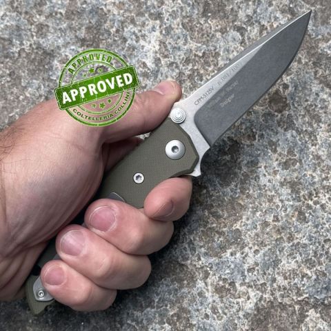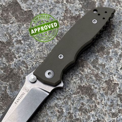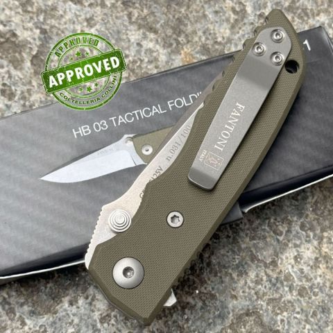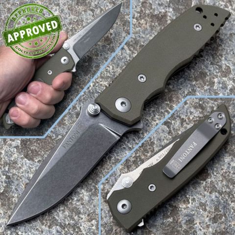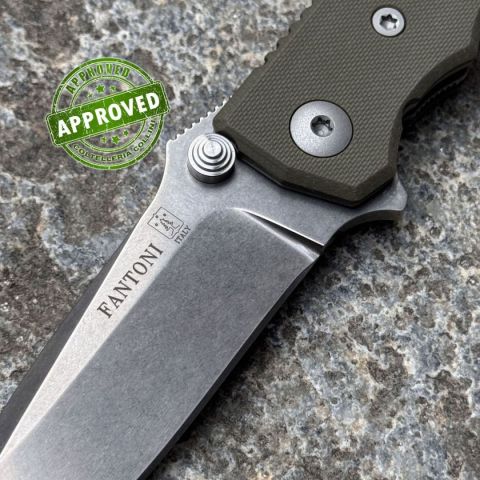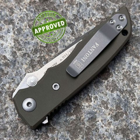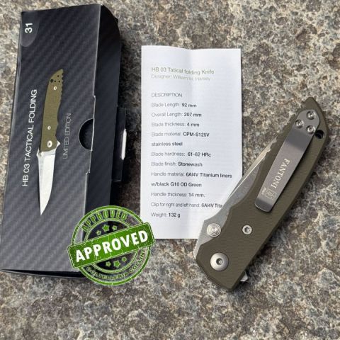 COLTELLO RITIRATO DA COLLEZIONE PRIVATA* Provenienza: Ritirato da un privato, precedentemente acquistato* Condizioni: Pari al nuovo, mai estratto dalla sua confezione* Reperibile in commercio: Fuori produzione* Affilatura: Di fabbrica* Segni su lama: Nessuno* Segni su impugnatura: Nessuno* Scatola: Presente* Fodero: Presente* Manuali, Certificati e Garanzie: Presenti* Controllato e Certificato dal nostro laboratorio interno Destinazione d'uso: Tattico/SportivoTipo di produzione: IndustrialePaese di produzione: ItaliaLama: In acciaio inox M390 61/62HRCTrattamento lama: Stone WashedManicatura: cartelle in titanio e guancette in G-10Lunghezza lama: 94mm.Spessore lama: 4mm.Lunghezza chiuso: 116mm.Lunghezza totale: 206mm.Spessore da chiuso: 15mm.Peso: 132g.Chiusura: Liner LockClip: Amovibile, in titanioConfezione: scatola in cartone con loghi FantoniNote: Edizione limitata e numerata realizzata in soli 100 pezzi - Apertura tramite sistema Carson Flipper - Design by William W. Harsey
