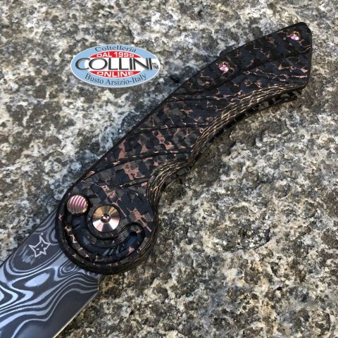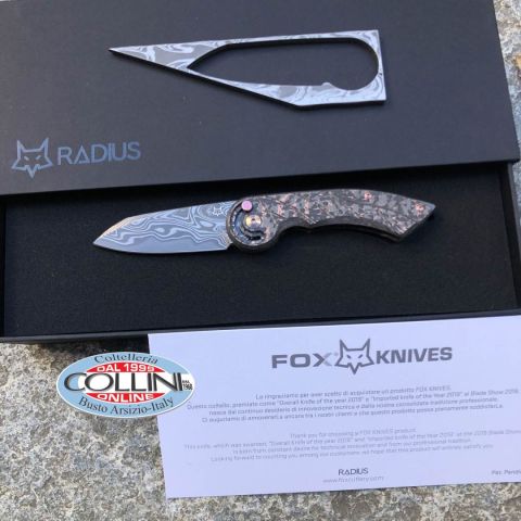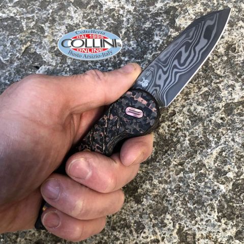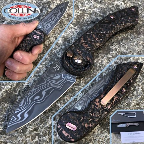 Destinazione d'uso: Collezione Tipo di produzione: IndustrialePaese di produzione: ItaliaLama: in acciaio damasco inox Damasteel Gysinge DS93XTrattamento lama: -Manicatura: Fibra di carbonio e RameLunghezza lama: 75mm.Spessore lama: 4mm.Lunghezza chiuso: 110mm.Lunghezza totale: 185mm.Peso: 115g.Chiusura: Fingers Safe Opening SystemClip: Titanio ricavato dal pienoConfezione: cofanetto con Fox Knives, pouch con zip in cuoio, parte dell'acciaio damasco avanzato dalla produzione della lamaNote: Edizione limitata realizzata unicamente in 15 esemplari numerata su coltello e scatola - Design by Denis Simonucci - Vincitore del Blade Show 2019 di Atlanta come "Coltello dell'anno" e "Coltello importato dell'anno"