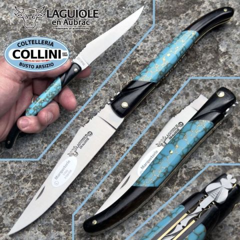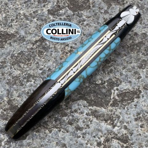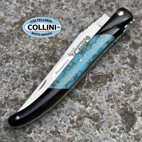 Questo elegante Laguiole fa parte della prestigiosa serie “Marqueterie Incrustée”, che unisce design sofisticato e materiali esclusivi. Il manico è realizzato in legno di ebano con un inserto in turchese azzurro finemente intarsiato con venature dorate, esaltate da inserti in ottone lucidato. Il guilloché inciso a mano lungo la molla, testimonia la lavorazione artigianale di alto livello. Un coltello da collezione dal grande impatto visivo, ideale per chi cerca raffinatezza e unicità. Destinazione d'uso: CollezioneTipo di produzione: ArtigianalePaese di produzione: FranciaLama: Acciaio inox SandvikFinitura lama: Satinata Manicatura: Ebano e turchese intarsiato con inserti doratiLunghezza lama: 100mmSpessore lama: 3mmLunghezza chiuso: 107mmLunghezza totale: 207mmSpessore da chiuso: 12mmPeso: 90gChiusura: SlipjointClip: AssenteConfezione: Scatola regalo e certificatoNote: Lavorazione guilloché a mano, manico con intarsio in pietra e ottone, esemplare unico