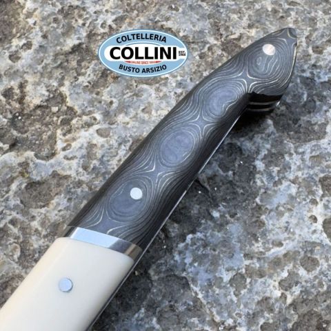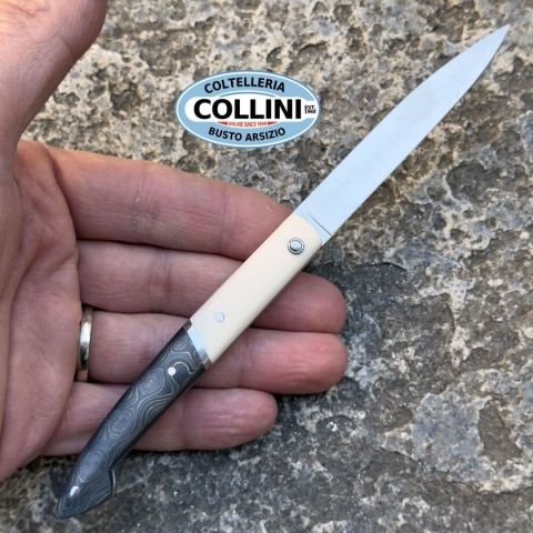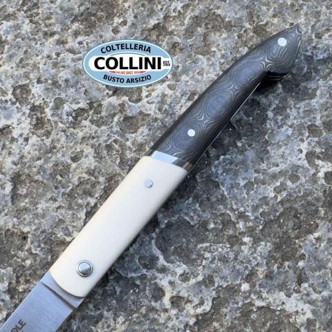 Il coltello Laguiole en Aubrac Le Capucin è un simbolo di artigianato e tradizione, realizzato con materiali di altissima qualità per garantire eleganza, prestazioni e durata nel tempo. La sua combinazione di manico in fibra di carbonio e Elforyn, un materiale che simula l'avorio, lo rende un pezzo unico e raffinato. Ideale sia per collezionisti che per amanti degli accessori di alta gamma. Destinazione d'uso: Sportivo/collezioneTipo di produzione: IndustrialePaese di produzione: FranciaLama: In acciaio inox 12C27Trattamento Lama: satinataManicatura: fibra di carbonio dorata ed ElforynLunghezza lama: 76mm.Spessore lama: 2mm.Lunghezza chiuso: 100mm.Lunghezza totale: 180mm.Peso: 40g.Chiusura: SlipJoint