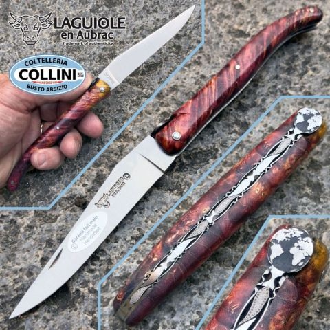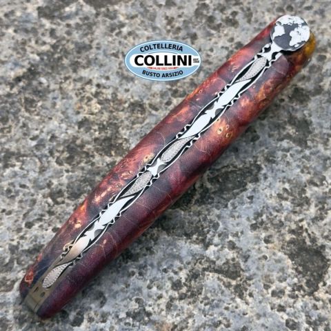 Il coltello Laguiole con manico in Fire Elder Burl rappresenta l’eccellenza dell’artigianato francese, unendo materiali pregiati e tradizione secolare in un oggetto raffinato e funzionale. Forgiato con lama in acciaio Sandvik, questo coltello tascabile è pensato per offrire tagli precisi e lunga durata, ideale per collezionisti e amanti della qualità autentica. Il manico, in radica di sambuco rosso fuoco stabilizzato, conferisce un’estetica unica e ricercata, arricchita dalla presenza di una molla finemente lavorata a mano, con inciso il planisfero terrestre decorativo sul dorso. Ogni dettaglio è curato con precisione estrema, per un accessorio elegante, pratico e dal fascino senza tempo. Destinazione d'uso: CollezioneTipo di produzione: ArtigianalePaese di produzione: FranciaLama: Acciaio inox SandvikFinitura lama: SatinataManicatura: Radica di Sambuco Rosso Fuoco stabilizzataLunghezza lama: 100mmSpessore lama: 3mmLunghezza chiuso: 107mmLunghezza totale: 207mmSpessore da chiuso
