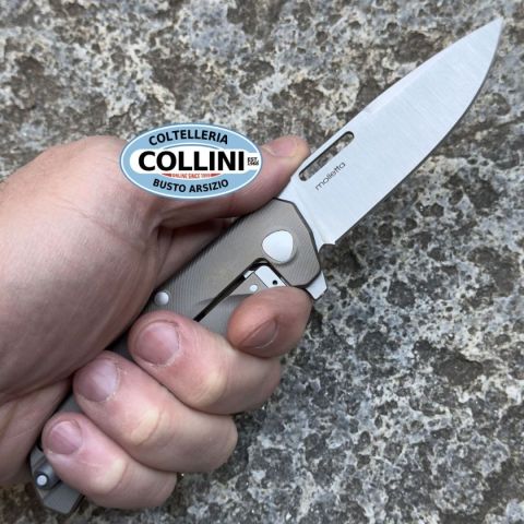 In occasione del decimo anniversario del modello T.R.E., vincitore del premio Overall Knife of the Year al Blade Show 2015, è pronto il nuovo folder EDC con molteplici opzioni di apertura: è il momento del Q4TTRO. Questo coltello leggero con blocco frame-lock presenta una lama in acciaio CPM-MagnaCut satinato, dotata del sistema “ReF” (Removable Flipper) e cuscinetti in ceramica per un'azione fluida e rapida. Il frame e la clip SOLID sono realizzati in titanio, mentre la piastra del manico è in FatCarbon. L'intero manico è progettato per una presa sicura e confortevole ed il distanziale in titanio si abbina alla clip SOLID. Intorno all'area del perno sono disponibili quattro opzioni di apertura manuale tra cui scegliere: linguetta di apertura posteriore (back flipper), flipper anteriore (front flipper), incisione per unghia (nail nick) oppure la classica apertura "a due mani".   Destinazione d'uso: Sportivo / Tattico Tipo di produzione: IndustrialePaese di produzione: ItaliaLama:
