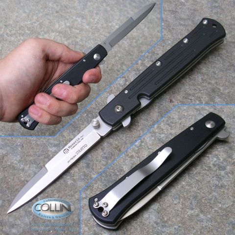 Maserin - Stiletto Hi-Tech Nero 620/N - coltelloDestinazione d'uso: SportivoTipo di produzione: industrialeLama: in acciaio inox 440 56HRCProduzione Lama: ItaliaManicatura: AlluminioLunghezza lama: 100mm.Spessore della lama: 2.5mm.Lunghezza chiuso: 130mm.Lunghezza totale: 230mm.Bilanciatura: -Peso: 125g.Chiusura: Liner LockClip: amovibile in acciaio inoxFodero: -Note: -