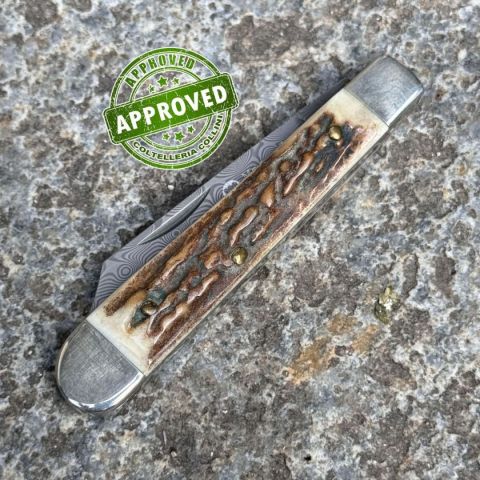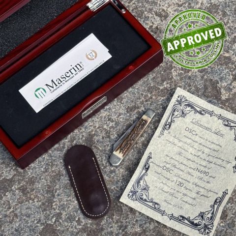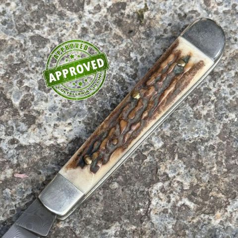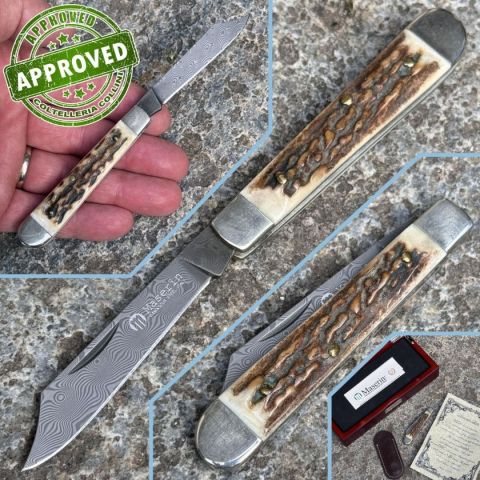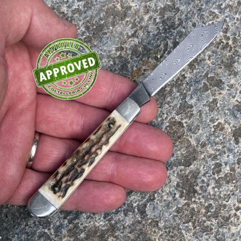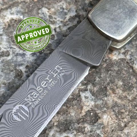COLTELLO RITIRATO DA COLLEZIONE PRIVATA * Provenienza: Ritirato da un privato, precedentemente acquistato * Condizioni: Globalmente in ottime condizioni * Reperibile in commercio: Fuori produzione * Affilatura: Di fabbrica * Segni su lama: Nessuno * Segni su impugnatura: Nessuno * Scatola: Presente * Fodero: Presente * Manuali, Certificati e Garanzie: Presenti * Controllato e Certificato dal nostro laboratorio interno Destinazione d'uso: da collezione / sportivoTipo di produzione: IndustrialePaese di produzione: ItaliaLama: In acciaio damasco inox DSC (N690Co + Nitro-B) a 120 strati con disegno Small RosesTrattamento lama: /Manicatura: Alpacca e CervoLunghezza lama: 63mm.Spessore lama: 2.5mm.Lunghezza chiuso: 79mm.Lunghezza totale: 142mm.Spessore da chiuso: 15mm.Peso: 59g.Chiusura: Slip JoinClip: assenteFodero: pouch in cuoio da tascaConfezione: cofanetto in legno con loghi maserinNote: coltello ritirato da collezione privata, precedentemente acquistato