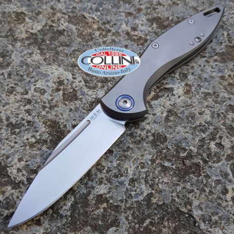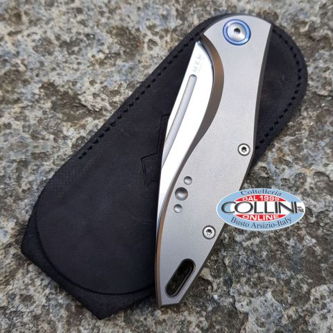 Coltello chiudibile realizzato da Mercury, con lama in acciaio BÖHLER M390 MICROCLEAN, satinata, apertura a due mani con unghia, meccanismo di rotazione con rondelle in PTFE, sistema slip joint senza blocco della lama, viteria in acciaio inox con ghiera su perno di rotazione in titanio anodizzato blu, molla in acciaio inox. Destinazione d'uso: Sportivo/Gentleman/EDC Tipo di produzione: Industriale Paese di produzione: Maniago - Italia Lama: in acciaio inox M390 60/61HRC Trattamento lama: Satinata Impugnatura: Titanio Lunghezza lama: 74mm. Spessore lama: 2.5mm. Lunghezza chiuso: 117mm. Lunghezza totale: 180mm. Spessore da chiuso: 11mm.Peso: 90g. Apertura: a due mani Washers: in acciaio Chiusura: Slip Joint Clip: - Fodero: tasca in cuoio con passante per cintura Confezione: Scatola di cartone con loghi MKM Maniago Knife Makers Note: Design by Lucas Burnley - Coltello prodotto da Mercury