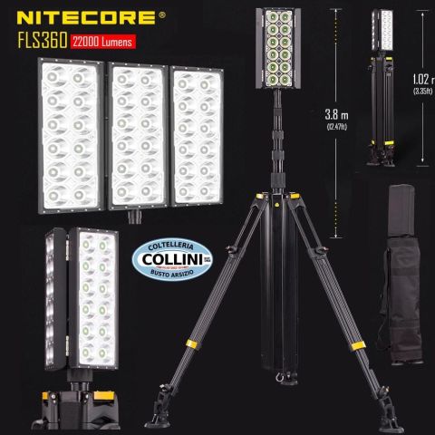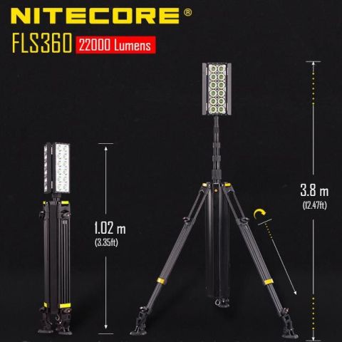 Nitecore FLS360 è un proiettore a LED ad alta potenza progettato per fornire un'illuminazione intensa e uniforme fino a 360° a 22,000 lumen. Equipaggiato con 36 LED CREE XM-L2, questo floodlight è ideale per applicazioni industriali, eventi all'aperto, e situazioni che richiedono una luce forte e affidabile senza la possibilità di alimentazione tramite corrente. Con una distanza massima del fascio di 897 metri e un'autonomia fino a 40 ore, il FLS360 combina prestazioni elevate con un design robusto e durevole. Include batterie ricaricabile, un'uscita ad alta intensità di 201,200 candele, e opzioni di montaggio flessibili, rendendono questo strumento perfetto per una vasta gamma di utilizzi professionali. Specifiche Tecniche Modalità di Luminosità e Output:Turbo: 200 W, 22,000 lumen, 3 ore di autonomiaAlta: 75 W, 10,000 lumen, 8 ore di autonomiaMedia: 33 W, 5,500 lumen, 18 ore di autonomiaBassa: 15 W, 2,000 lumen, 40 ore di autonomiaCapacità della Batteria: 600 WhVoltaggio della Batteri