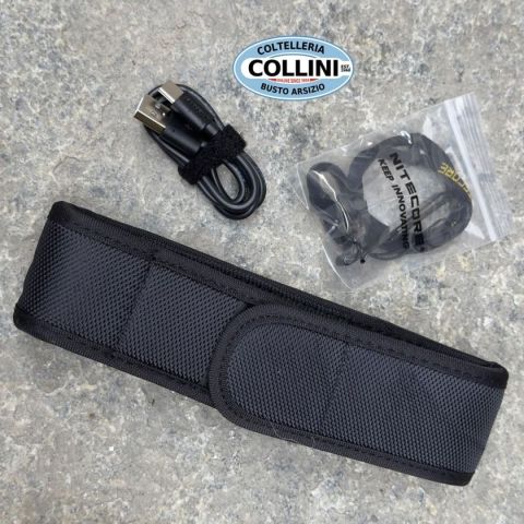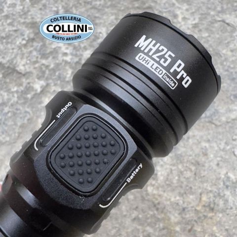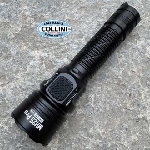 KIT torcia MH25 PRO + accensione remota RSW1 PRO CARATTERISTICHE CHIAVE: * Utilizza un LED UHi40 con una potenza massima di uscita di 3300 lumens* Massima intensità luminosa pari a 124.300cd e portata massima di 705 metri* Vetri e parabole con trattamenti antiriflesso, crystal coating e con PDOT (Precision Digital Optics Technology)* Il pulsante posteriore di accensione e quello laterale di selezione controllano 5 differenti livelli di luminosità e 3 modalità speciali * La modalità STROBO cambia costantemente frequenza in modo casuale, per massimizzare gli effetti di disorientamento.* Indicazioni visive di modalità luminosa selezionata e di carica residua* Circuiti integrati di ricarica tramite porta USB-C* Batteria ricaricabile agli ioni di litio NITECORE 21700 (NL2150 5.300 mAh) inclusa * Circuiti elettronici altamente efficiente che forniscono illuminazione stabile e continua* Tecnologia ATR (Advanced Temperature Regulation) di regolazione della temperatura (Brevetto N° ZL2015105345