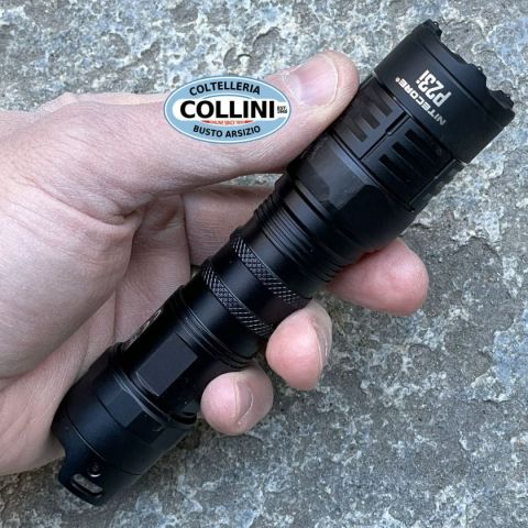 La torcia tattica Nitecore P23i è l'ultima nata della serie Precise. Utilizzando un LED Luminus SFT-70 con un sistema ottico combinato con rivestimento in cristallo e "Precision Digital Optics Technology" (PDOT), raggiunge una potenza massima di 3.000 lumens, ideale per le forze dell'ordine, le operazioni di assalto, l'autodifesa, la ricerca e le pattuglie. Led: 1x Luminus SFT-70 LED con un ciclo vitale di 50.000 oreModi Operativi: 4, regolati elettronicamente + StroboPotenze e Durate: 3000 lumens (30min.) -> 1500 Lumens (2h 30min) -> 800 Lumens (4h) -> 250 Lumens (10h) ->50 Lumens (45h) -> Strobo 3000 lumensPicco di potenza: 55300 candeleDistanza di illuminazione massima: 470m.Metodo di accensione: Pulsante Posteriore con sistema "Momentary On" per segnalazioni luminose e Pulsante Posteriore "Mode" per accedere immediatamente alla funzione strobo, che rimane attiva fino a quando il pulsante rimane premutoMetodo di selezione luminosa: Con la torcia accesa, pre