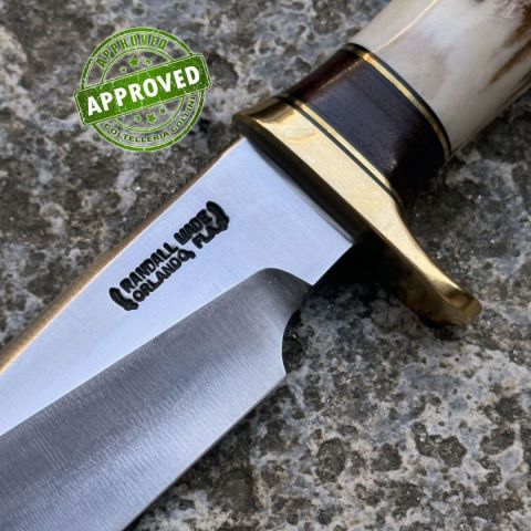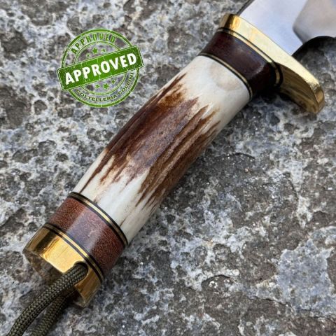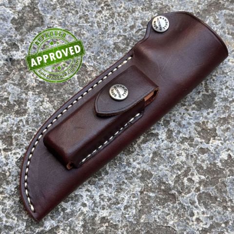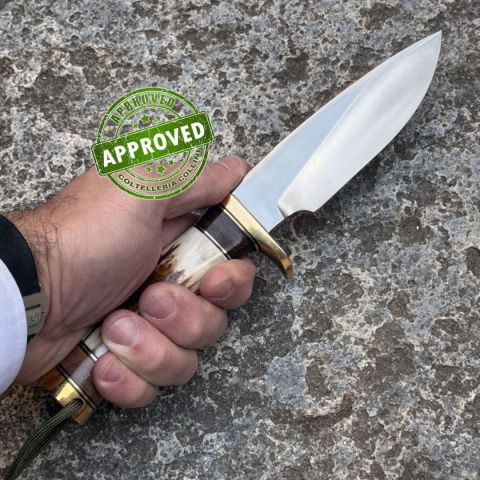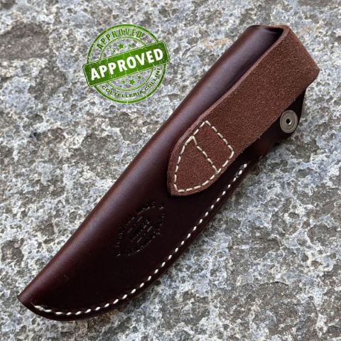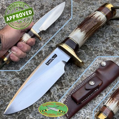 COLTELLO PROVENIENTE DA UNA COLLEZIONE PRIVATA* Tipologia: Coltello precedentemente acquistato e ritirato da una collezione privata* Condizioni: Pari al nuovo, mai utilizzato, mai estratto dalla confezione originale e mai inserito nel proprio fodero* Reperibile in commercio: Di difficile reperibilità* Affilatura: Di fabbrica* Segni su lama: Nessuno* Segni su impugnatura: Nessuno* Scatola: -* Fodero: Perfetto, mai utilizzato, in cuoio ingrassato* Manuali, Certificati e Garanzie: -Controllato e Certificato dal nostro laboratorio interno Coltello da caccia con punta drop, eccellente per scuoio e come light allround utility. La costruzione del manico ricorda un design degli anni '30. Le tacche per il pollice e la parte superiore dell'elsa sono modellate per il posizionamento del pollice. Il modello presenta molteplici personalizzazioni rispetto al modello standard come l'elsa singola e codolo in ottone, il manico in legno di Cervo ed Anelli di Cuoio ed il fodero in pellame ingrassat