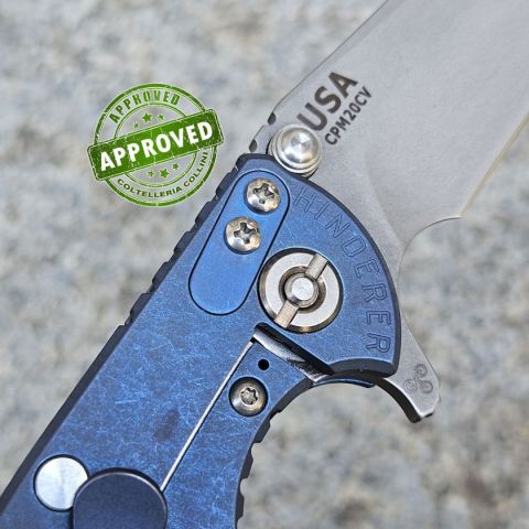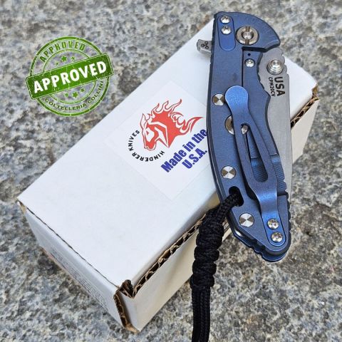 COLTELLO RITIRATO DA COLLEZIONE PRIVATA* Tipologia: Precedentemente Acquistato* Condizioni: Globalmente in otime condizioni, un paio di piccole abrasioni sulle anodizzazioni azzurre del titanio* Reperibile in commercio: Di difficile reperibilità* Affilatura: Di fabbrica* Segni su lama: Nessuno* Segni su impugnatura: un paio di piccole abrasioni sulle anodizzazioni azzurre del titanio* Scatola: Presente* Fodero: /* Manuali, Certificati e Garanzie: Presenti* Controllato e Certificato dal nostro laboratorio interno Destinazione d'uso: Tattico / Collezione Tipo di produzione: Midtech (semi-artigianale)Paese di produzione: USALama: in acciaio inox CPM-20CVTrattamento lama: StonewashedManicatura: guancetta in G10 nero di 2mm di spessore su liner in titanio 6AL4V di 1mm. Frame in titanio 6AL4V, ricavato dal pieno, di 3mm di spessore, con anodizzazione Battle Blue ed Hinderer Lockbar Stabilizer. Spaziatori e viteria in acciaio inox 17-4PHLunghezza lama: 76mm.Spessore lama: 3mm.Lung