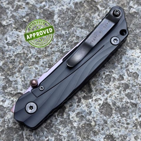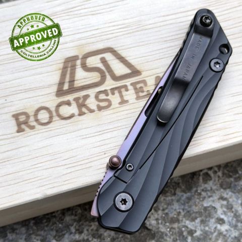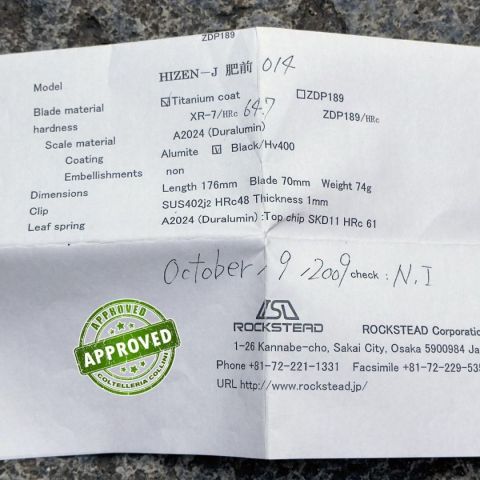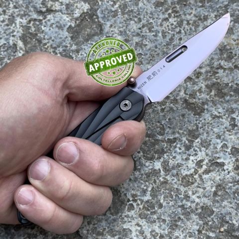 COLTELLO RITIRATO DA COLLEZIONE PRIVATA* Provenienza: Ritirato da un privato, precedentemente acquistato* Condizioni: Globalmente in buone condizioni, qualche piccola abrasione su clip e viteria* Reperibile in commercio: Fuori produzione* Affilatura: Di fabbrica* Segni su lama: Nessuno* Segni su impugnatura: Piccole abrasioni su clip e viteria* Scatola: Presente* Fodero: /* Manuali, Certificati e Garanzie: Presenti* Controllato e Certificato dal nostro laboratorio interno Coltello ritirato da collezione privata - Rockstead Hizen realizzato nel 2009 con un particolare trattamento esterno in titanio che oltre a proteggere, attribuisce alla lama una colorazione violacea molto particolare. Destinazione d'uso: Collezione / SportivoTipo di produzione: MidtechPaese di produzione: Sakai - JapanLama: in acciaio Hitachi YXR7 a 64,7 HRCTrattamento lama: Black Titanium coat a specchioImpugnatura: Duralluminio A7075 con anodizzazione a Hv400 di durezzaLunghezza lama: 70mm.Spessore lama: 3.3mm.Lungh