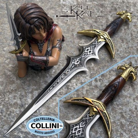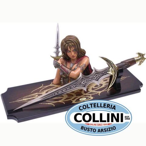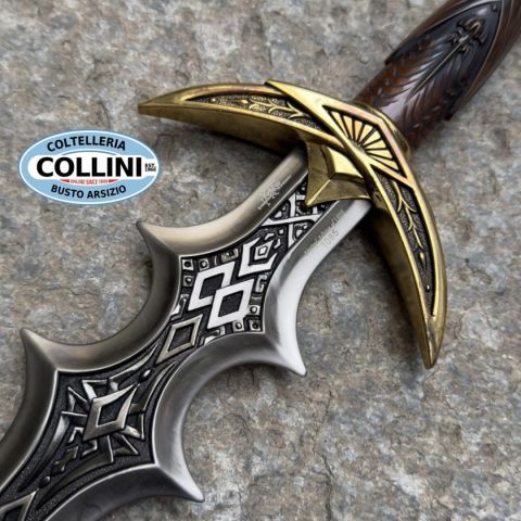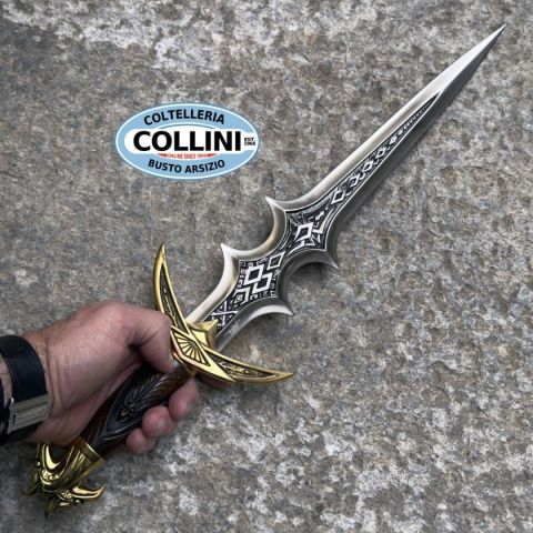 Pugnale Navros - Edizione Limitata Oro 4° Anniversario Nome del Modello: Pugnale NavrosEdizione: Limitata, 1.500 pezzi serializzatiProduttore: United Cutlery Brands Descrizione del Prodotto:Questo pugnale da collezione, conosciuto come la "Lama del Caos Antico", è stato un tempo arma del mago Navros. Conosciuto anche come il Pugnale del Mago, è caratterizzato da un'impugnatura lavorata in finto ambra e parti del manico in metallo solido con finitura placcata argento antico. Il pomolo è adornato da teste di falco gemelle, mentre l'incantesimo di Evruc, Uno Antico della Quarta Era, è inciso sulla lama. Caratteristiche: Lunghezza della Lama: 34,93 cmLunghezza Totale: 52 cmMateriale del Manico: Metallo solido, dettagli in finto ambraFinitura: Placcatura in argento antico su parti metalliche del manicoLama: Metallo fuso, placcato nichel lucido, non affilata Caratteristiche dell'Edizione Speciale: Finitura del Manico: Parti in metallo solido con finitura placcata in oro 24-KStatuetta: Base d