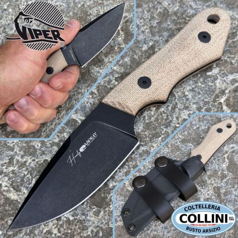 Il Viper Handy è un coltello fisso innovativo e compatto, progettato per offrire un'esperienza d'uso ottimale grazie all'impiego di tecnologie di produzione avanzate e materiali di alta qualità. Ideato dal maestro Fabrizio Silvestrelli, questo coltello si distingue per la sua leggerezza ed ergonomia, garantendo una maneggevolezza eccezionale e un utilizzo confortevole anche durante sessioni prolungate. Il Viper Handy, con la sua lama fissa in acciaio CPM MagnaCut, offre un'elevata resistenza e una durata eccezionale. La linea è stata arricchita con la serie caratterizzata da una lama con finitura dark stonewashed. L'impugnatura in canvas micarta naturale, lavorata in 3D, si adatta perfettamente alla mano, garantendo una presa sicura e precisa. Il codolo del manico, assottigliato verso il retro, favorisce un bilanciamento ottimale del coltello, riducendo l'affaticamento durante l'utilizzo prolungato. Questo rende il Viper Handy ideale per attività outdoor e di caccia, nonché per operazi