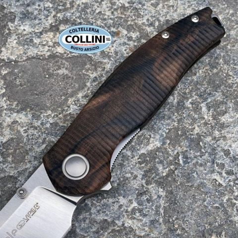Gli appassionati conoscono il valore di un buon coltello. Viper onora questa idea con il suo coltello EDC di alta qualità, chiamato Vale, realizzato con materiali selezionati. La lama MagnaCut si apre delicatamente grazie al perno per il pollice ed è bloccata in posizione dal robusto liner lock. Il manico in noce presenta intagli sul dorso della lama, offrendo una sensazione piacevole e un lavoro sicuro. Il backspacer in pregiato titanio completa l'aspetto armonioso del coltello. Inoltre, è dotato di un passante per il cordino e di una clip ribaltabile Destinazione d'uso: EDCTipo di produzione: IndustrialePaese di Produzione: ItaliaLama: In acciaio CPM MagnaCutFinitura Lama: SatinataManicatura: legno di noceLunghezza lama: 75mm (tagliente di 68mm.)Spessore lama: 4mm.Lunghezza chiuso: 111mm.Lunghezza totale: 184mm.Spessore da chiuso:15mm.Peso: 95g.Chiusura: Liner LockClip: in titanio Confezione: scatola in cartone con loghi ViperNote: Design by Jesper Voxnaes
