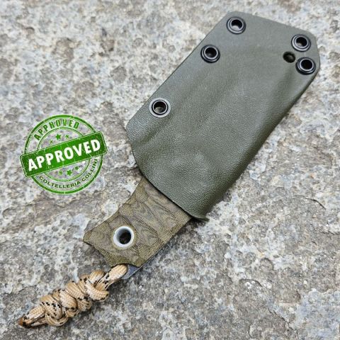 COLTELLO RITIRATO DA COLLEZIONE PRIVATA* Provenienza: Ritirato da un privato, precedentemente acquistato* Condizioni: Pari al nuovo* Reperibile in commercio: esemplare unico, realizzato artigianalmente* Affilatura: Di fabbrica* Segni su lama: Nessuna* Segni su impugnatura: Nessuno* Scatola: /* Fodero: Presente* Manuali, Certificati e Garanzie: /* Controllato e Certificato dal nostro laboratorio interno Tipo di produzione: ArtigianalePaese di produzionea: ItaliaLama: in acciaio D2 a 59/60HRCFinitura lama: GunKoteManicatura: Micarta fissata con pin tube in alluminioLunghezza lama: 65mm.Spessore lama: 6.5mm.Lunghezza totale: 128mm.Bilanciatura: arretrataPeso: 198g.Fodero: in Kydex, termoformatoConfezione: -Note: coltello precedentemente acquistato, proveniente da una collezione privata