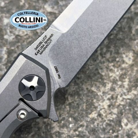 Destinazione d'uso: Tattico/MilitareTipo di produzione: IndustrialePaese di produzione: USALama: In acciaio CPM-MagnaCutTrattamento lama: StonewashedManicatura: Titanio e Fibra di Carbonio bluLunghezza lama: 104mm.Spessore lama: 4mm.Lunghezza chiuso: 131mm.Lunghezza totale: 235mm.Spessore da chiuso: 13mm.Peso: 132g.Chiusura: Frame LockClip: Amovibile, multiposizione, in acciaio inoxConfezione: scatola in cartone con loghi Zero ToleranceNote: Design by Dmitry Sinkevich - Apertura KVT su cuscinetti a sfera - Apertura tramite sistema Carson Flipper