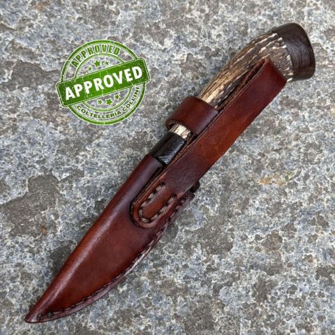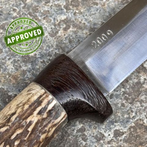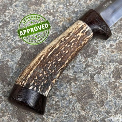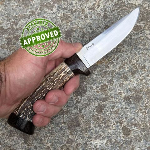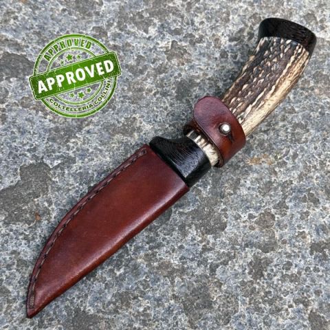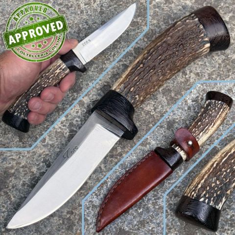 COLTELLO RITIRATO DA COLLEZIONE PRIVATA* Tipologia: Precedentemente Acquistato* Condizioni: In ottime condizioni* Reperibile in commercio esemplare unico del 2009* Affilatura: Originale* Segni su lama: Dati dalla forgiatura* Segni su impugnatura: /* Confezione: /* Fodero: In cuoio, prodotto artigianalmente, in ottime condizioni* Manuali, Certificati e Garanzie: /* Controllato e Certificato dal nostro laboratorio interno I coltelli dell'artigiano Torc prendono spunto dai coltelli di una volta, di chiara tradizione contadina e rurale. Ogni coltello è costruito interamente a mano con materiali naturali abbinati tra di loro in modo sapiente; le finiture sono estremamente curate ed ogni modello è un pezzo unico. Destinazione d'uso: caccia / collezioneTipo di produzione: artigianalePaese di produzione: ItaliaLama: in acciaio inox artigianale, realizzato a forgia (lega non dichiarata)Finitura lama: lucidata e leggermenta satinata, con segni della forgiaturaManicatura: Cervo europeo e l