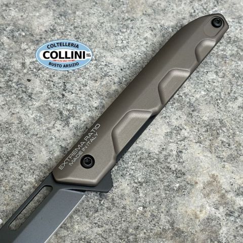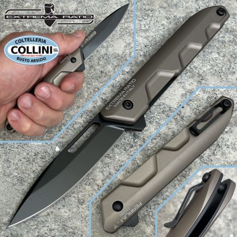 Ferrum T è un coltello chiudibile di chiara connotazione tattica dotato di lama spear point con asola di alleggerimento. Ha una forma sottile e compatta, le due guancette in alluminio anticorodal anodizzato compongono una manicatura leggera, slanciata ed allo stesso tempo molto resistente. Può essere alloggiato in un taschino, in piccole fondine per torce o all’interno di un singolo passante del sistema M.O.L.L.E.Dotato di sistema di apertura assistita flipper, la lama ruota su cuscinetti a sfere che permettono un movimento della lama fluido e privo d’incertezze. Questo meccanismo permette all’utilizzatore un’apertura rapida ed agevole della lama, anche con una sola mano. Il sistema di blocco adottato è l’ormai collaudato liner lock. La clip reversibile è posizionata posteriormente.Ferrum T è disponibile in 2 versioni: la prima, FERRUM T Black Warfare, dotato di manicatura in colore nero e lama Geotech Camo, l’innovativo ed originale pattern mimetico Extrema Ratio, realizzato mediante