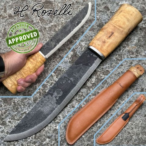 COLTELLO RITIRATO DA COLLEZIONE PRIVATA* Tipologia: Precedentemente Acquistato* Condizioni: Pari al nuovo* Reperibile in commercio Si* Affilatura: Originale* Segni su lama: NO* Segni su impugnatura: NO* Confezione: NO* Fodero: In cuoio, prodotto artigianalmente* Manuali, Certificati e Garanzie: Si* Controllato e Certificato dal nostro laboratorio interno Con le sue grandi dimensioni e il suo peso, il Big Leuku sembra un mix tra un ascia e un machete. Il Big Leuku di Roselli è uno strumento tradizionale finlandese fatto a mano utilizzato da sempre da pastori di renne e da carpentieri, per tagliare, separare le ossa, intagliare e per molti altri compiti nella vita all'aria aperta e nella sopravvivenza nella natura selvaggia. La lama è realizzata in acciaio al carbonio forgiato e l'impugnatura è in betulla riccia, rivestita con olio di lino, che garantisce una presa salda, anche se bagnata. Viene fornito con una guaina realizzata a m