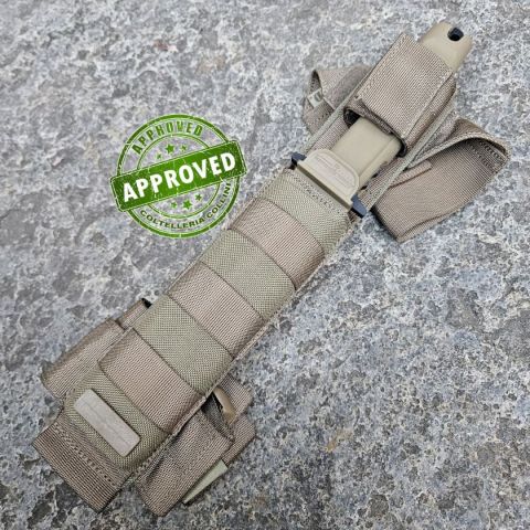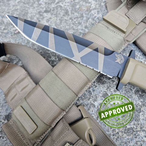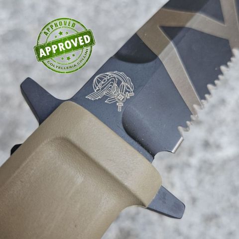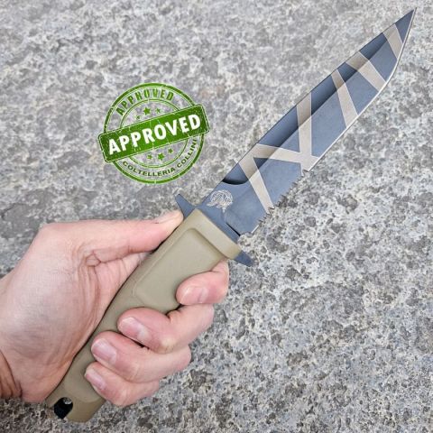COLTELLO RITIRATO DA COLLEZIONE PRIVATA* Provenienza: Ritirato da un privato, precedentemente acquistato* Condizioni: Nuovo, mai utilizzato, privo di scatola originale* Reperibile in commercio: Ancora a catalogo, ma ormai proposto senza loghi del "9° Col Moschin" sulla lama* Affilatura: Di fabbrica* Segni su lama: Nessuno* Segni su impugnatura: Nessuno* Scatola: Assente* Fodero: Presente, nuovo* Manuali, Certificati e Garanzie: Presenti* Controllato e Certificato dal nostro laboratorio interno Commissionato ed adottato ufficialmente nel 2002 dal noto 9° Rgt. Incursori “Col Moschin”, questo modello esprime la quintessenza del coltello da combattimento puro. Ispirato ai pugnali con lama asimmetrica ed impugnatura dritta ma orientata degli Arditi, da cui il Reggimento trae le proprie vestigia, è stato rielaborato in chiave moderna. Il baricentro è fortemente arretrato, la punta particolarmente perforante. È leggero, maneggevole ed i